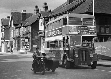 This picture was taken in Woodbridge Road, Guildford, about 1961, and shows one of the 32 “tin fronted” Dennis Lance K4 buses unique to the Aldershot and District Traction Company. The first 20 of these had East Lancs L28/28 bodywork of the type shown, and the final 12 were bodied by Weymann with a version of the Orion, again seating 56 with 28 on each deck. The Gardner 5LW engines in these buses were removed from withdrawn Lancets of 1940 vintage, but were rebuilt and updated to the latest specification to virtually new standard. As usual with A&D buses, these vehicles had five speed gearboxes. I never drove one of these, but I understand that, with their slow revving (1700 rpm) 94 bhp engines they were less than lively, and not popular with the Aldershot and District driving staff, who christened them “Lulus” from their registration letters. The motorcycle and sidecar combination overtaking the bus is entirely characteristic of those times and something that is never seen today. I cannot identify the make of motorbike, but it is certainly something of a veteran itself as it has girder type front forks.