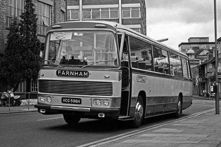 Having vacillated for some time before settling upon an underfloor engined saloon chassis, even buying some full fronted Dennis Lancet III coaches in 1953, Aldershot & District finally chose the AEC Reliance as its standard single decker, and stayed with this model for its coach requirements right up to its subjugation to Thames Valley (mis)management from January 1972 under the new guise of Alder Valley. Seen here in The Grove alongside Aldershot Bus Station is No.596, VCG 596H, the first of four 6U3ZR Reliances supplied in 1970 with Duple C49F coachwork sporting the (to my eye) hideous Detroit “inspired” front grille that spoilt many of the later Duple designs. Aldershot & District bought two more Reliances of the 6U3ZR specification in 1971, but these had the aesthetically more pleasing Plaxton C49F coachwork. VCG 596 passed to Alder Valley from 1 January 1972 as No. 49.