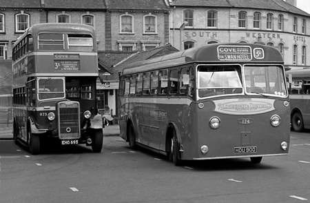 The Hobbs transmission revealed early weaknesses, and it was replaced in both running Dominants by standard Dennis two plate clutches and five speed gearboxes. The demonstrator was sold to Trimdon Motor Services who registered it MUP 297 and ran it, now without the supercharger, for seven years, before selling it on to become a mobile shop. The other Dominant remained in the Aldershot & District fleet from 1951 for fourteen years, spending much of that time ploughing its way on the Aldershot – Cove group of services. It is seen here in 1961 leaving Aldershot Bus Station with Weymann L25/26R rebodied Guy Arab I of 1943 No.873, EHO 695 alongside. This Arab was one of a number of such chassis originally destined for, but ultimately not wanted by London Transport. It was initially fitted for A&D service with a Strachans L22/26R body, rebodied in 1950, and finally withdrawn in 1962.