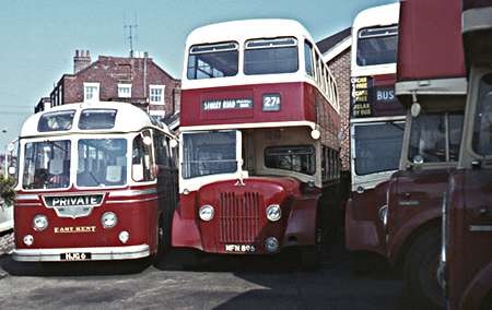 The picture was taken in Canterbury in 1967 when East Kent was still a BET company, and shows 1954 Lancet UF HJG 6, by then reseated to C41C, alongside 1957 Arab IV MFN 896, with another Arab of the same type to its right. These Arabs originally presented a full destination blind display, but by 1967 the aperture had been reduced to a single line. On the right hand edge of the photo are two of the ugly duckling Park Royal Regent Vs of 1961 onwards that eventually totalled 121 in the fleet.