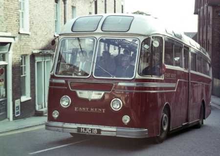 This picture of East Kent HJG 18, a Dennis Lancet UF with Duple C41C body, was taken in Rye in 1967. East Kent, like fellow BET operator Aldershot & District, was a great fan of the pre war and post war vertical engined Dennis Lancet, and, in 1954, took delivery of 30 of the underfloor engined Lancet UF. This was the largest single order for this model, of which only 71 examples were built between 1953 and 1961. Aldershot and District tried out the Strachan bodied Lancet UF demonstrator, but bought none, though it continued to run the unique Dennis Dominant for fifteen years. One can now only speculate as to the reasons for the commercial non acceptance of the Lancet UF. Certainly reliability could not have been a problem. East Kent kept their UFs for 14 to 17 years. The low driving position was received with suspicion in certain quarters back in 1953, yet now it is a standard feature on touring coaches. The power plant was a horizontal version of the advanced, smooth running 24 valve 7.58 litre O6 engine fitted in the Lancet III, though the maximum engine speed was raised to 2000 rpm to give 110 bhp. Some later examples for Glenton Tours had the 120 bhp 8 litre version of this engine. The gearbox was the standard Dennis five speed constant mesh unit with preselective overdrive, but revised to operate in the conventional sequence with lowest gears to the left and highest to the right – the vertical engined Lancet gearbox worked the “wrong way round” from right to left. Possibly a major factor in the low uptake of the Lancet UF was the employment of a fully hydraulic braking system, which has never been popular with engineers outside of London Transport and Midland Red. Hydraulic fluid is costly, whereas air for air pressure or vacuum brakes is free. It is noteworthy that the initial version of the AEC Reliance that came to reign supreme with both East Kent and Aldershot & District had a straightforward, direct top (not overdrive) five speed synchromesh gearbox and vacuum brakes, though their wet liner engines were certainly not trouble free.