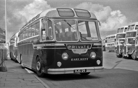 Here is another of these fine East Kent Lancet UFs. HJG 29 is seen pictured in Canterbury Bus Station in 1961. Another vehicle of this class is parked behind it. This handsome 1954 style of Duple body compares very favourably with the bulbous abomination fitted to 1961 Black and White Reliance 8222 AD. It was somewhere about 1960 that Duple began to lose its way in my opinion.