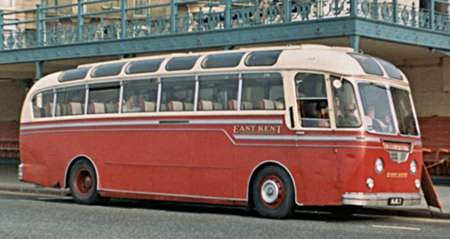 This photo taken on Margate seafront in about 1966 shows HJG 3 numerically the first of a batch of 30 Dennis Lancet UF’s fitted with Duple Ambassador C41C bodies delivered to East Kent in 1954 these made up the largest fleet of Lancet UF’s in the country. Looking at this photo again recently I thought how the elegant simplicity of both the coachwork and the superb East Kent livery set one another off beautifully, on the Lancet the windscreens were set lower than on the contemporary Royal Tiger’s and Regal IV’s due to the Lancet’s lower driving position which also made the skylights above the screens more upright also the cab windows and the pillar behind the cab was a different shape.