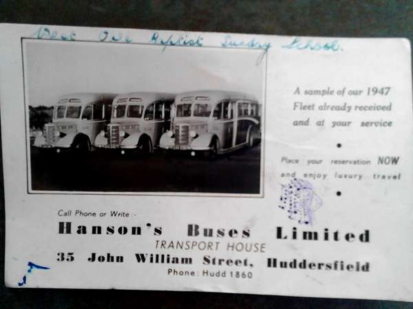 Barbara, that is a wonderful and now probably unique piece of bus ephemera. Do you still have it? I would love to see it. I was brought up in the Hanson operating area, and remember them from my childhood in the 1950’s till their final demise in 1974 when the coach business was sold to the West Yorkshire PTE. I now live in the Halifax area.