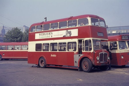 I believe that at first 301 and 302 were initially allocated to Bradford Park Lane garage to operate Hebble’s share of the 64 Bradford-Brighouse-Huddersfield, as I saw them only occasionally in their early days passing our house at Stump Cross, Halifax, but 303 was based at Halifax and quickly became a regular sight on the 7/17 services to Bradford, and was a favourite for operating the very fast-timed Saturdays-only 29 “Wibsey Flyer” to Bradford via Wibsey. After these Hebble switched to forward entrance Mk. V’s and the cream front cowls continued to be applied for a while, but by 1960 they had reverted to red. Originally in red with a single cream band above the lower deck windows, they later had the cream extended around those windows, then following the delivery of their first and only new Fleetline in 1966 cream was also applied around the upper deck windows too, as shown in the photo above. The fleetnames were originally of the block capital style with the middle letters undelined, but later an italic style was adopted.