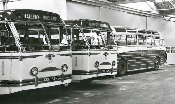 The picture shows from left Fleet Nos 27 and 26, CCP 225/224. They are Leyland PSU1/15 Royal Tigers with Leyland C41C bodies new in 1952 as Nos 54 and 55. They were renumbered in 1957, and were withdrawn in 1964. To the right of them is one of the 4 Bellhouse Hartwell C37C bodied Leyland PSU1/15s. New in 1954 they were given Fleet Nos 71-72, Registered ECP 205-206, and 73-74 Registered ECP 499-500. They were withdrawn in 1966.