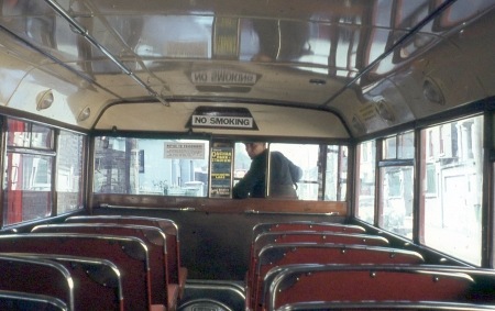 “I was on the Isle of Man to explore the railways, but found the IOMR had just closed! Lord Ailsa came along the following year, which is why there is still something left. Another reason for going everywhere by bus. So I’m afraid I know nothing about buses, although I remember the bus I took the interior shot of made a lovely noise. It seems to have LEYLAND on the gearbox(?) casing. So I cannot tell you more about them. The bus was at Peel and taken on 28.5.66.”