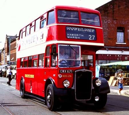 Keighley – West Yorkshire was established as a branch of West Yorkshire Road Car in 1930, if we believe the entry on Wikipedia. CWX 671 was new to KWY in 1938 and is a Bristol K5G, but the bodywork is not what one might expect, being by Roe rather than by ECW, and is to L27/28R layout being rebodied in 1950, it originally did have an ECW L27/26R body. We see her in North Albert Street, on the corner of Kent Street, Fleetwood, arriving to take her place for Tram Sunday on 20 July 2003.