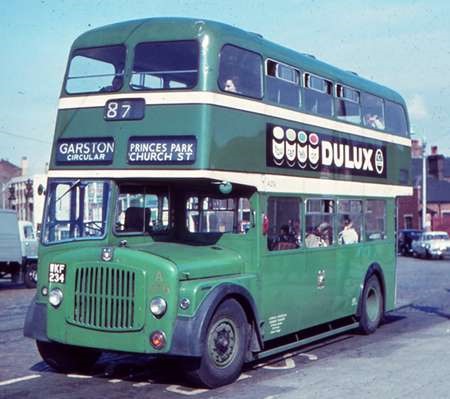 The original livery had a cream band right round the bus just above the lower deck windows, and a narrower, similar one below the upper deck windows; the green was also darker. The livery in this picture dates from about 1964 I think.