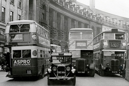An Austin 12/4 Low Loader taxi fronts this Regent Street evocative scene. Many of these were commandeered by the London Fire Brigade to haul portable pumps during the Blitz, a task for which they were greatly under-powered!