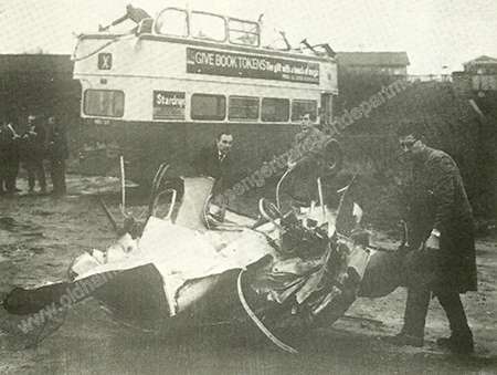 Peter Furnival makes mention of Double Deckers going under Hollinwood Station Bridge. Well here is a picture of Oldham Corporation Passenger Transport Department NBU 515 having carried out just such a manoeuvre. The gentlemen ‘wrapping up’ the top deck for transportation back to Wallshaw Street Depot, are from left to right:-