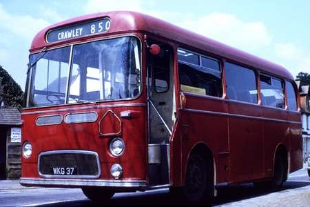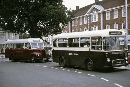 John Wylde’s initial involvement with bus operation occurred with the Orpington Rural Transport Association which operated a service between Biggin Hill and Orpington from 1963. Wylde departed Association shortly afterwards and began running services as North Downs Rural Transport between Orpington and Croydon, with journeys later serving the then new development at Forestdale, Addington. In 1969 North Downs acquired the Mitchell’s coaching business that ran rural services from Warnham into Horsham. Then, In October 1970, A.T. Brady of Forest Green retired and his routes between Horsham, Forest Green and Guildford were taken over by North Downs and the Brady livery of brown and cream was adopted for “new” arrivals in the fleet. To complement the assorted acquired vehicles Wylde bought a trio of ex Western Welsh Albion Nimbus saloons, WKG 34/37/48, and numbered these 17/18/19. The first and last received the brown livery, but WKG 37 remained in Western Welsh red to the end of operations which occurred very suddenly on 17 April 1972. The pictures show WKG 48 in Horsham Carfax in October 1971. Behind it , operating the Horsham – Ewhurst – Forest Green route, is Tillingbourne Guy GS MXX 382, which had been hired in to cover mechanical problems at Forest Green, a portent of what was to come. The unrepainted Nimbus WKG 37 is seen at Rusper on the poorly patronised meandering rural service between Horsham and Crawley, a route that was withdrawn some months before the collapse of the business.
