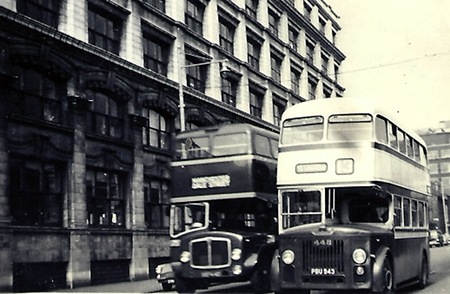 The vehicle on the right is one of Oldham Corporations 1958 “Tin front” Titans fleet number 443, it was transferred to SELNEC on November 1969, and re-numbered 5343 in that fleet. In this photograph it is still in the Crimson and White lined out livery, which Oldham used until 1966, when replaced with Pommard and Devon Cream. It is photographed in Lever Street Manchester, (destination blinds showed Stephenson Square), operating the service 13 to Uppermill via Oldham and Scouthead. This service was a Limited Stop service operated jointly with Manchester Corporation Transport.