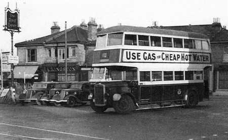 The Portsmouth Corporation Tilling Stevens seen on the Red Deer forecourt in South Croydon was photographed between October 1940 and February 1941. The row of houses behind the bus, and the school behind the houses were flattened when a bomb fell on the school on 5th February 1941. About 100 yards to the left, the South Croydon bus garage was bombed on 10th May 1941, destroying the building and 65 buses which had been refuelled ready for the next morning. Seven men were killed in the explosion.