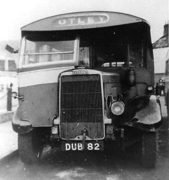 This Leyland Cheetah lightweight vehicle was one of Mr. G. F. Tate’s “Barnaby trio” and was inexplicably placed into store at Otley very shortly after the end of WW2. It languished quietly in the Otley Carriers van depot in Bondgate for many years before very unexpectedly being taken into the depot and fully overhauled and repainted. The Barnaby bodies were somewhat quaint for the mid 1930s but I loved them. They combined very sound construction with “kindly” looks and vintage features like spinning rooftop ventilators and wooden plank ceilings and, in the case of DUB 82, an incredible seating capacity of 39, three passengers at the top of the entrance steps facing backwards !! This fine machine re-entered service lacking the luxury of an offside headlamp or anywhere to put one – the Traffic Commissioners didn’t seem to mind – and was a spirited performer on the Otley – Wetherby service where its ascent of Harewood Bank with a 4.7 litre engine was little short of spectacular. Strangely, in its second career, it was never given any fleetnames which really was a shame. Eventually withdrawn permanently on New Year’s Eve 1952 it sadly ended its days in the Eller Ghyll scrapyard which was always a very unhappy sight to behold.