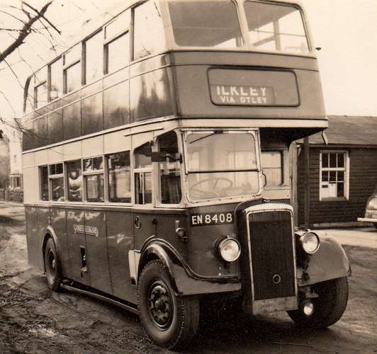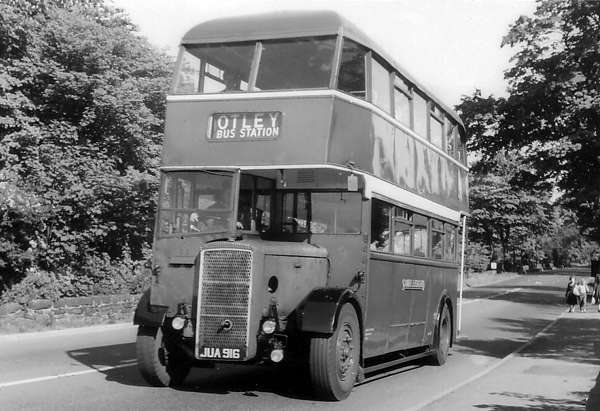 This Daimler CWA6 “utility” vehicle was one of a batch of four allocated to Samuel Ledgard in the dark days of WW2 and had Roe bodywork with more than a slight cheeky resemblance to East Yorkshire’s famous “Beverley Bar” design. 916 was the only one of the four at Otley Depot and for reasons long lost in the past was withdrawn very early indeed, but was not banished to any hidden dark premises like others. It spent I should say a good couple of years in the top left corner at the back of the garage, taking up useful working space and becoming progressively sadder and shabbier as the months went by. I hope I shall be taken seriously when I relate that a seed must have blown into the garage roof and established itself in one of the upper deck corner pillars of 916 where it developed into quite a presentable sapling, to everyone’s amusement. Apparently a very sudden policy change redeemed the bus and it was then given an extremely thorough complete overhaul and fitted with London Transport “STL” type seats. The paintwork, always immaculately executed by Arthur Mann and Benny, was arguably one of their finest achievements and the immaculate and potent motor became a very firm favourite with us all – it even sported a loud but tuneful repeater bell encased in a tamper proof metal box on the platform. So, after entering service with wooden seats in the sinister very serious atmosphere of 1943, JUA 916 ended its career on the last day of January in 1961 and defied the odds by being in finer condition than when it was new !!