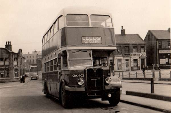 Just before Mr. G.F.Tate’s demise in 1943, Leyland “Light Lion” ANW 586 waits in Edward Street for the Rawdon stand in Vicar Lane Bus Station to become free – note the delightful Barnaby spinning ventilators on the planked canvas covered roof. The London Transport petrol ST is about to tackle the gruelling journey to Harrogate in the same time as the modern day powerful giants often find difficult. (Photo source WYIS)