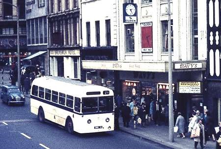 Sheffield 13 (originally 213) is passing a splendid array of shop fronts in Haymarket, Sheffield on a midday 29 to Blackburn (in Rotherham – not Lancashire). This was a works service to Shardlows Works midway between Sheffield and Rotherham. A low bridge required the use of single deckers. I cannot recall seeing a bus on this service showing a destination so presumably was not on the standard blinds. An oddity of this bus by this date (August 1967) was the plain cream front presumably after an accident damage repair. As delivered it had a City of Oxford style swoop painted blue a feature which was retained by sisters 12 and 14 to the end of their service life. I used to chat to a Greenland Depot Fitter when he worked at Greyhound in Sheffield on a Saturday afternoon. I recall him saying how unreliable these three buses were with repeated clutch and door failures. He told me one Bank Holiday weekend all three were sent on Peak District extras and all three had to be towed back to garage.