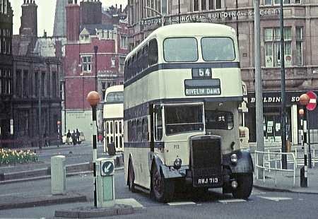 713 was one of the batch of 56 (the largest single batch of buses purchased by Sheffield) delivered in March/April 1954 to replace trams on the Ecclesall – City – Middlewood route. Apart from accident victim 707, all the batch were withdrawn in 1967 and 1968 so 713 had only a short service life left by the time of this picture.