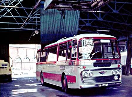Definitely not taken on a tour, this is PMT Stoke No1 Garage underneath the Essex bus washing machine on 19th April 1970. PMT was going through a reliability crisis and amongst other vehicles (see Birmingham 2252 elsewhere on this site) hired in some coaches from Sheffield United Tours in their very elegant red/grey livery which well suited the lines of the Panorama body.
