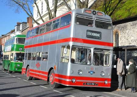 A Leyland Atlantean PDR1/1 with Weymann L73F body, joining the fleet of Silver Star, Porton Down near Salisbury, in 1962. This first view shows her on duty in Winchester, during the King Alfred running day on 1 January 2010.