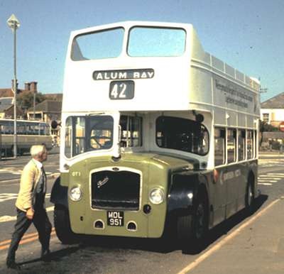 Here is a view of MDL 951. She was new to Southern Vectis in 1956 with an ECW H33/24R body, but, in this view, she has been converted to O60R format. She’s in the “dual purpose” version of NBC livery as OT1. We see her at Yarmouth, on a sunny evening in June 1974. The blind has just been changed for another trip and the driver walks round to check it. She isn’t mentioned in the 2012 PSVC listing, but her sister 954 is.