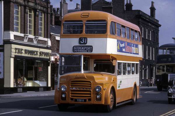 Pictured on Warrington St., Ashton in full SELNEC colours and renumbered 5806, YDB 6 was Stockport’s 6, a PD2A/30 of 1963. This batch introduced Frank Brimelow’s interior colour scheme changes as well as re-starting the fleet numbering at 1. Though Stockport removed nut guard rings, all deliveries from 1958 to 1967 included rear wheel discs which were only discarded from 1968. This batch, 1-10, was the second for Stockport with the St Helens front. In Stockport’s scheme the bonnet and grille were all red with black mudguards and tended to unbalance an otherwise elegant colour scheme. The massive areas of SELNEC orange apparent in a frontal view went that much further and was just too much.