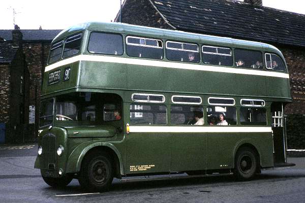 With SELNEC Southern legal lettering and looking particularly dull, 279 ATU a 1957 Daimler CVG6/Northern Counties H36/28R had been upseated from H33/28R in 1963. Once 79 in the SHMD fleet and, when photographed at an unknown location, numbered 5679 with SELNEC, the standee windows were a feature of Frank Brimelow’s orders. Like all front engined SHMD double deckers, this vehicle featured a bell cord on the lower deck.
