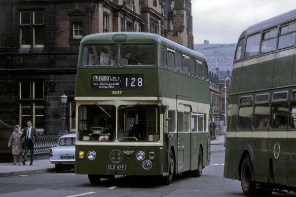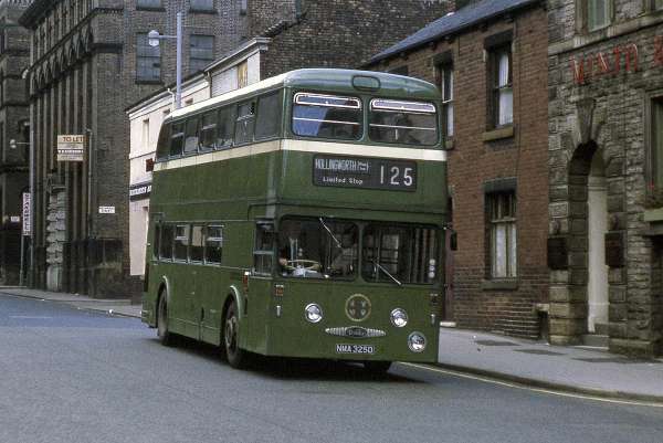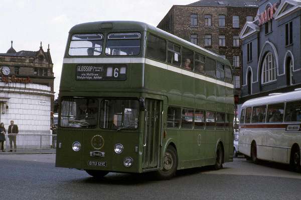 The Daimler badges seemed to do badly on the first batch. GTU 121C leaves Lower Mosely St on route 6 for Glossop still in full SHMD livery and legal lettering with vestiges of the fluted wings still in situ.
