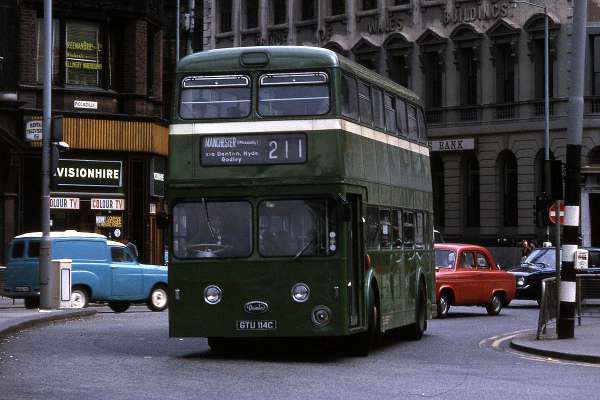Devoid of fleet number, fleet name, coats of arms or anything else other than legal ownership details to advise passengers of the operator and with the fluted wings missing from the Daimler badge, GTU 114C, 5614 in SELNEC’s inventory and originally 14 with SHMD, enters Portland St., Manchester at the end of its journey from Hattersley, a Manchester overspill area between Hyde and Mottram. Joint with Manchester but not, to the Stockport’s concerns annoyance, with North Western, the route number is in the Manchester trolleybus series but no trolleybus ever reached Hattersley. The number was originally allocated to the Stevenson Sq. to Greengate via Moston trolleybus service which headed away from Manchester at almost ninety degrees to its later incarnation. The logic of the reallocation was that the 210 served Gee Cross via Hyde and the 211 used the same route as far as Hyde town centre.