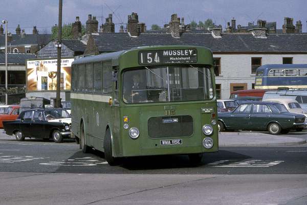 The REs were a good buy and spent most of their lives on the 154/154A services, which were restricted to single-deck operation due to a low arched bridge at Black Rock, between Stalybridge and bottom Mossley. SHMD double-deckers carried a notice in the cab specifically prohibiting them from going under this bridge. However, they could get through, as the double-deck trams had once done, in the middle of the road and in more recent years the layout has been modified using traffic light control to route all traffic through the centre of the arch. I think it saw several lorry strikes but I’m not aware of any buses hitting the bridge. RE 117 still survives today although as yet unrestored.