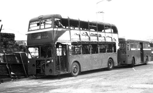 The single-door Fleetlines are all in original condition in these photos. They were gradually converted for one-man operation and ended up with a flap below the nearside windscreen like those seen on the short Fleetlines and REs – note that burnt-out 37 already has this. They all acquired a second (offside) foglight later in life, probably on first recertification from 1972 onwards.