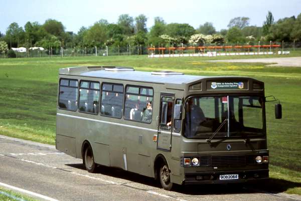 I can’t identify make and model of chassis or body, but I can tell you that, until very recently, USAF were buying vehicles intended for UK service over here: Leyland Sherpa vans and Renault buses, for example. It helped when they were selling them on. Their registrations have, typically, been arranged as year of purchase, B for Britain, and a number. I attach a view of such a vehicle, though it is well outside the normal scope of this site. 90B2064 was seen on duty at RAF Mildenhall in May 2001. I can’t help but wonder – my magnifying glass isn’t powerful enough! – if the N is not actually the first digit.
