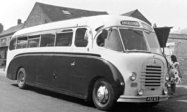 This is the original FS32 Vega body of metal-framed construction. KWX 413 was new in 1951, one of a pair bought from Duple by the Comberhill Motors dealership in Wakefield. It later ran for Wigmore (Excelsior) of Dinnington before moving to Price of Wrockwardine Wood (Shropshire) in 1963. Rather than change the eyebrow blind Price started to use the Excelsior name himself! The vehicle went from Price to Canham of Whittlesey but returned to Shropshire at the end of its life with Williamson of Shrewsbury. Sister vehicle KWX 412 ended up in the Shetland Islands and is currently preserved. (Photographer unknown)