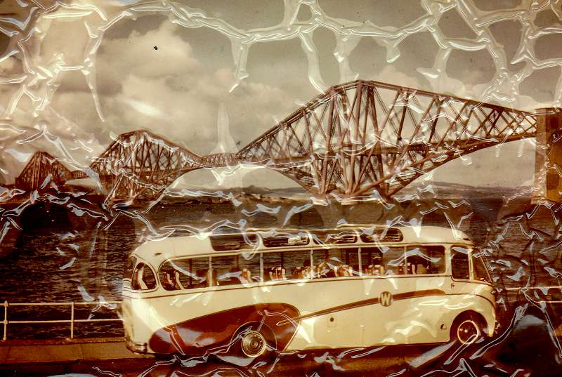 A somewhat damaged colour picture of an unknown registration Scottish Touring coach. Forth Bridge in the background.