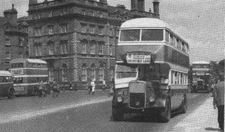 This picture was taken at York Station in 1937, and shows the vehicle, in its original livery, on the ‘Circle’ route – 1/8, Tang Hall – Beckfield Lane – Burton Stone Lane. The vertical line in the middle of the ‘bible’ indicator clearly suggests that the flap would have been turned over like the page in a book rather than being raised or lowered. However, the entire ‘bible’ would have needed to be changed some 15 or 16 times a day on this service – something of a chore for the crews.